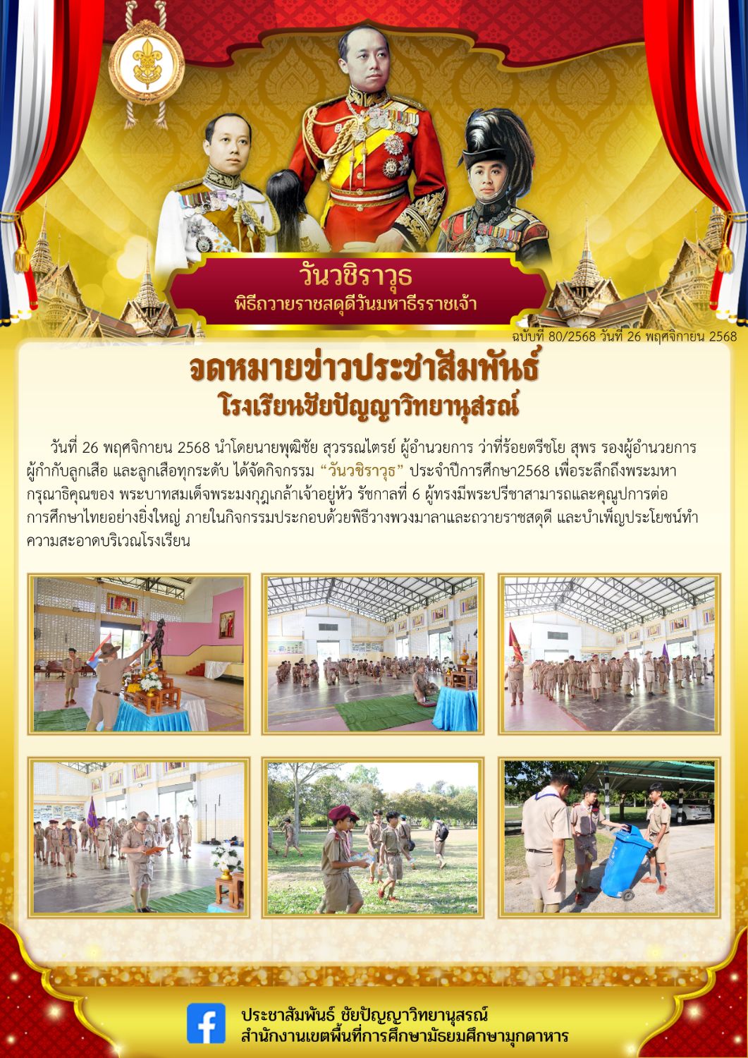 วันที่ 26 พฤศจิกายน 2568 นำโดยนายพุฒิชัย สุวรรณไตรย์ ผู้อำนวยการ ว่าที่ร้อยตรีชโย สุพร รองผู้อำนวยการ ผู้กำกับลูกเสือ และลูกเสือทุกระดับ ได้จัดกิจกรรม “วันวชิราวุธ” ประจำปีการศึกษา2568 เพื่อระลึกถึงพระมหากรุณาธิคุณของ พระบาทสมเด็จพระมงกุฎเกล้าเจ้าอยู่หัว รัชกาลที่ 6 ผู้ทรงมีพระปรีชาสามารถและคุณูปการต่อการศึกษาไทยอย่างยิ่งใหญ่ ภายในกิจกรรมประกอบด้วยพิธีวางพวงมาลาและถวายราชสดุดี และบำเพ็ญประโยชน์ทำความสะอาดบริเวณโรงเรียน |