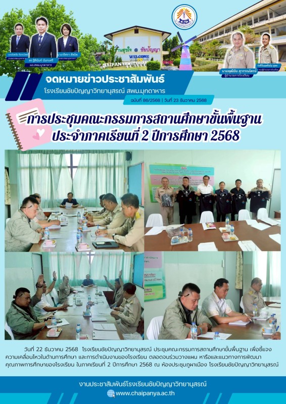 วันที่ 22 ธันวาคม 2568 โรงเรียนชัยปัญญาวิทยานุสรณ์ ประชุมคณะกรรมการสถานศึกษาขั้นพื้นฐาน เพื่อชี้แจงความเคลื่อนไหวในด้านการศึกษา และการดำเนินงานของโรงเรียน ตลอดจนร่วมวางแผน หารือและแนวทางการพัฒนาคุณภาพการศึกษาของโรงเรียน ในภาคเรียนที่ 2 ปีการศึกษา 2568 ณ ห้องประชุมภูผาเมือง โรงเรียนชัยปัญญาวิทยานุสรณ์ |