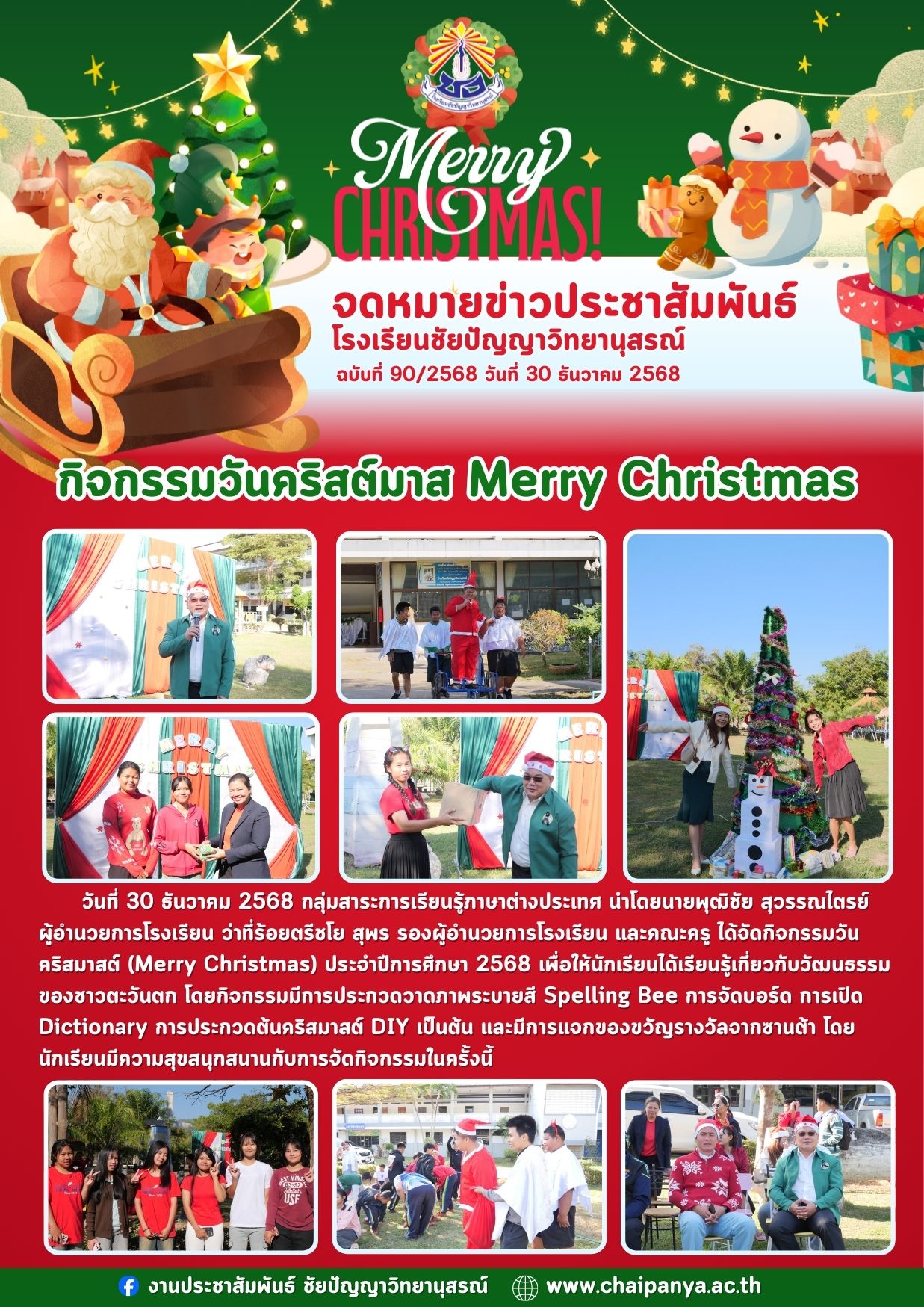 วันที่ 30 ธันวาคม 2568 กลุ่มสาระการเรียนรู้ภาษาต่างประเทศ นำโดยนายพุฒิชัย สุวรรณไตรย์ ผู้อำนวยการโรงเรียน ว่าที่ร้อยตรีชโย สุพร รองผู้อำนวยการโรงเรียน และคณะครู ได้จัดกิจกรรมวัน คริสมาสต์ (Merry Christmas) ประจำปีการศึกษา 2568 เพื่อให้นักเรียนได้เรียนรู้เกี่ยวกับวัฒนธรรม ของชาวตะวันตก โดยกิจกรรมมีการประกวดวาดภาพระบายสี Spelling Bee การจัดบอร์ด การเปิด Dictionary การประกวดต้นคริสมาสต์ DIY เป็นต้น และมีการแจกของขวัญรางวัลจากซานต้า โดยนักเรียนมีความสุขสนุกสนานกับการจัดกิจกรรมในครั้งนี้ |