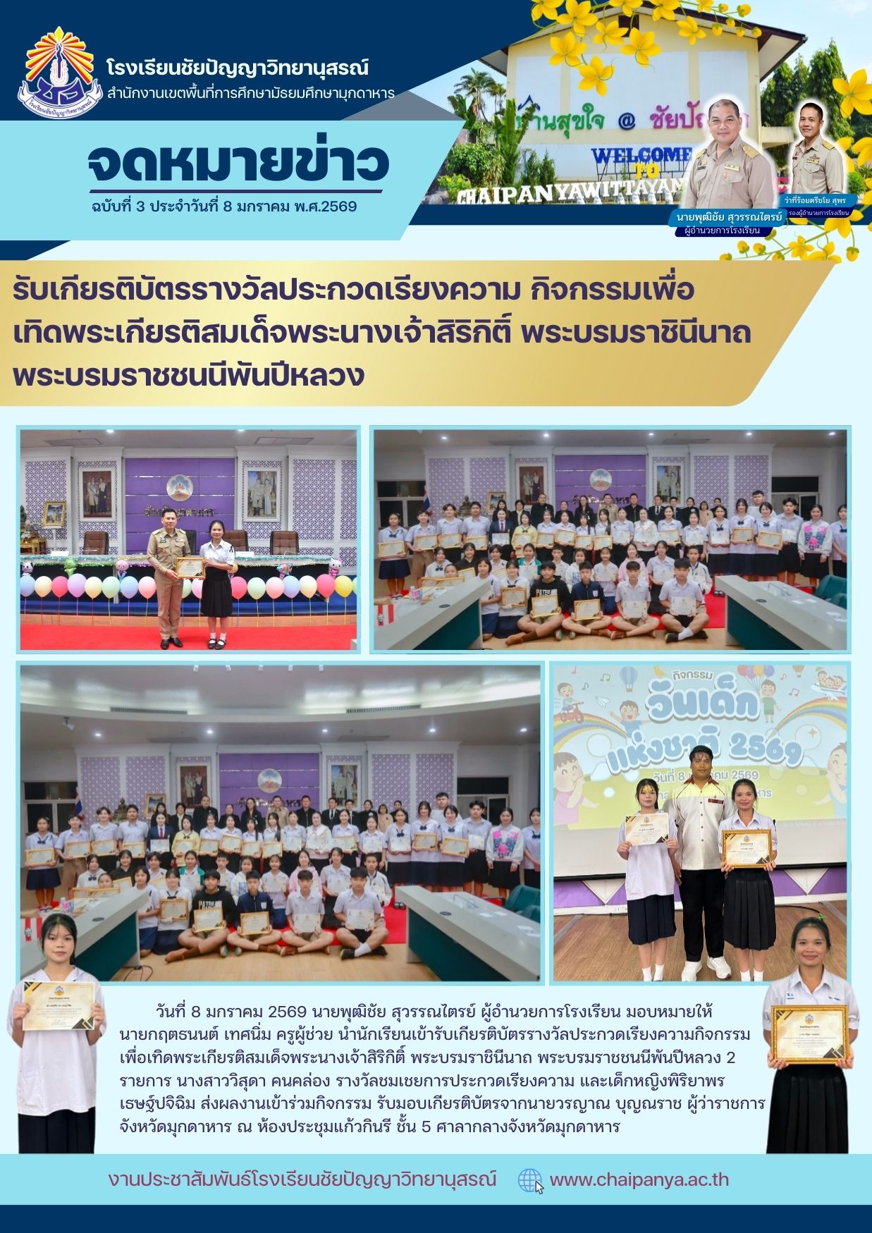 วันที่ 8 มกราคม 2569 นายพุฒิชัย สุวรรณไตรย์ ผู้อำนวยการโรงเรียน มอบหมายให้ นายกฤตธนนต์ เทศนิ่ม ครูผู้ช่วย นำนักเรียนเข้ารับเกียรติบัตรรางวัลประกวดเรียงความกิจกรรมเพื่อเทิดพระเกียรติสมเด็จพระนางเจ้าสิริกิติ์ พระบรมราชินีนาถ พระบรมราชชนนีพันปีหลวง 2 รายการ นางสาววิสุดา คนคล่อง รางวัลชมเชยการประกวดเรียงความ และเด็กหญิงพิริยาพร เธษฐ์ปจิฉิม ส่งผลงานเข้าร่วมกิจกรรม รับมอบเกียรติบัตรจากนายวรญาณ บุญณราช ผู้ว่าราชการจังหวัดมุกดาหาร ณ ห้องประชุมแก้วกินรี ชั้น 5 ศาลากลางจังหวัดมุกดาหาร |