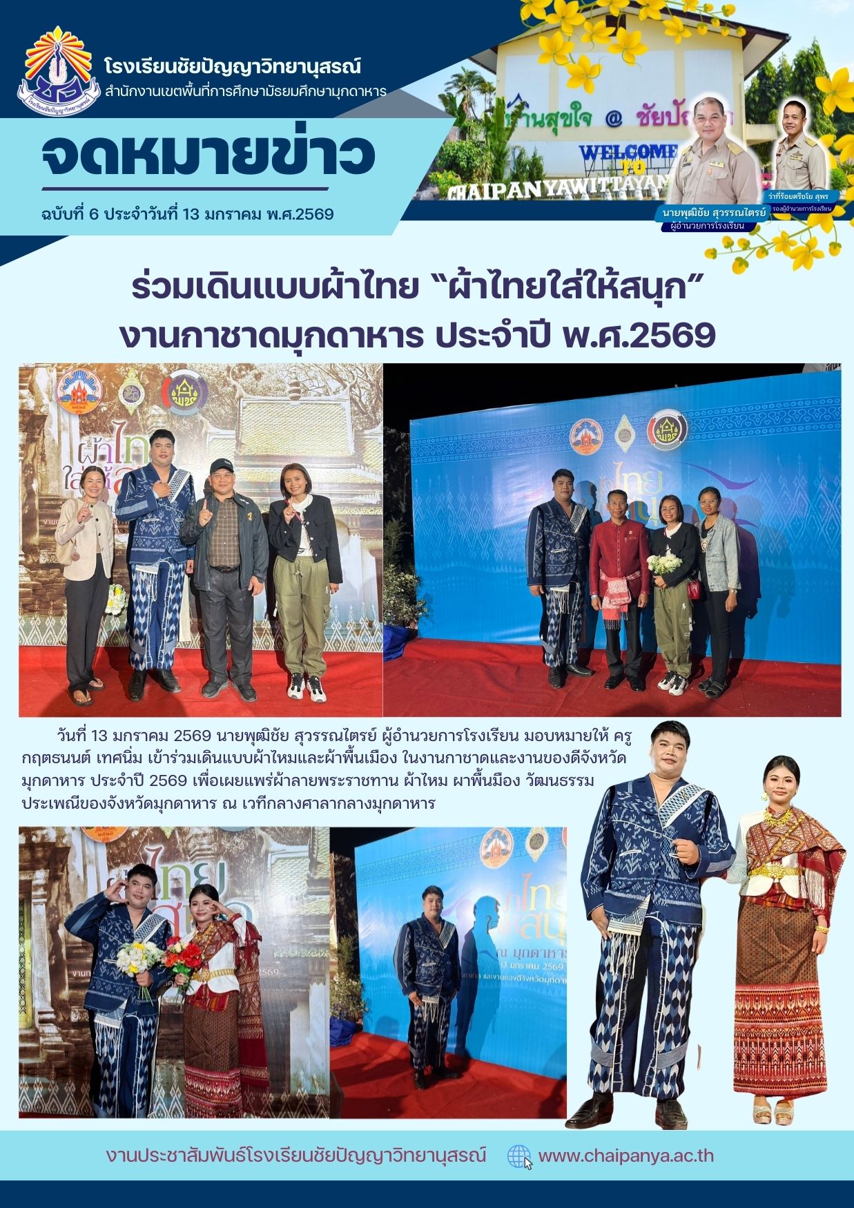 วันที่ 13 มกราคม 2569 นายพุฒิชัย สุวรรณไตรย์ ผู้อำนวยการโรงเรียน มอบหมายให้ ครูกฤตธนนต์ เทศนิ่ม เข้าร่วมเดินแบบผ้าไหมและผ้าพื้นเมือง ในงานกาชาดและงานของดีจังหวัดมุกดาหาร ประจำปี 2569 เพื่อเผยแพร่ผ้าลายพระราชทาน ผ้าไหม ผาพื้นมือง วัฒนธรรม ประเพณีของจังหวัดมุกดาหาร ณ เวทีกลางศาลากลางมุกดาหาร |