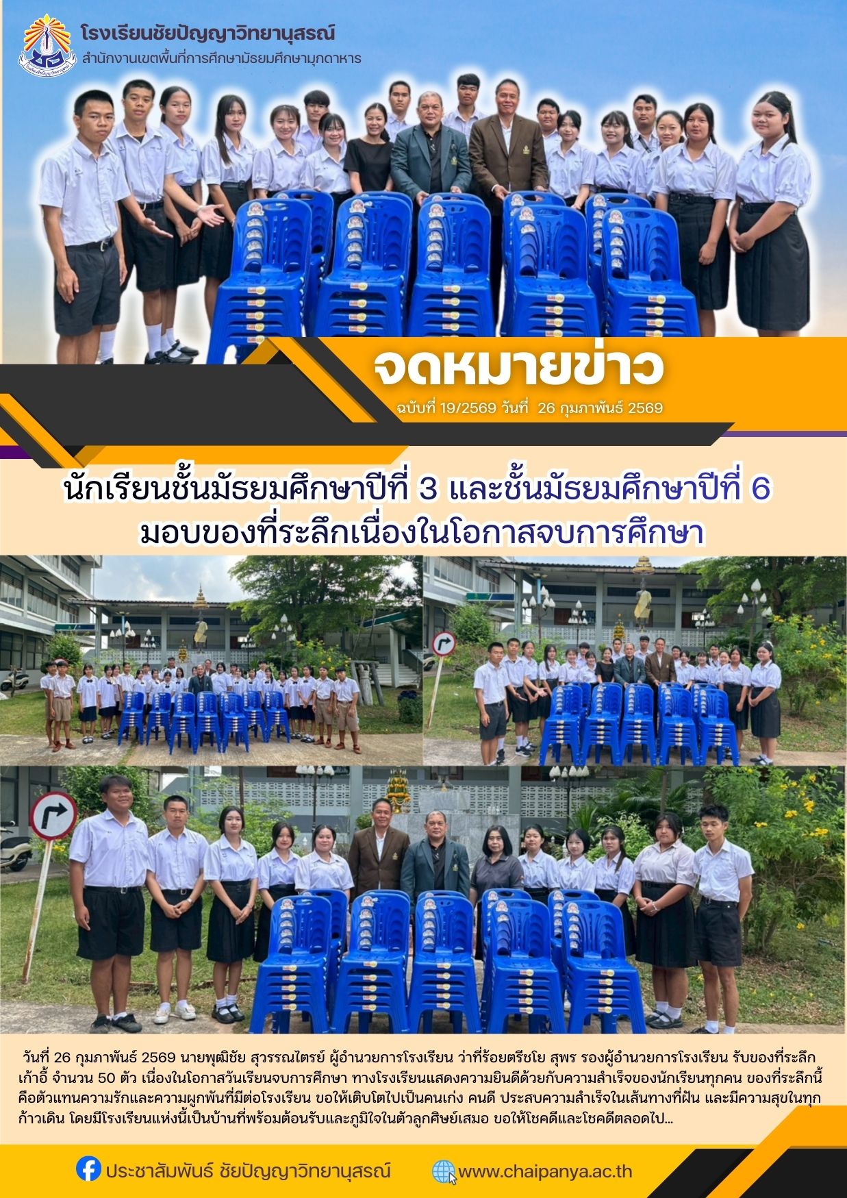 วันที่ 26 กุมภาพันธ์ 2569 นายพุฒิชัย สุวรรณไตรย์ ผู้อำนวยการโรงเรียน ว่าที่ร้อยตรีชโย สุพร รองผู้อำนวยการโรงเรียน รับของที่ระลึก เก้าอี้ จำนวน 50 ตัว เนื่องในโอกาสวันเรียนจบการศึกษา ทางโรงเรียนแสดงความยินดีด้วยกับความสำเร็จของนักเรียนทุกคน ของที่ระลึกนี้คือตัวแทนความรักและความผูกพันที่มีต่อโรงเรียน ขอให้เติบโตไปเป็นคนเก่ง คนดี ประสบความสำเร็จในเส้นทางที่ฝัน และมีความสุขในทุกก้าวเดิน โดยมีโรงเรียนแห่งนี้เป็นบ้านที่พร้อมต้อนรับและภูมิใจในตัวลูกศิษย์เสมอ ขอให้โชคดีและโชคดีตลอดไป... |