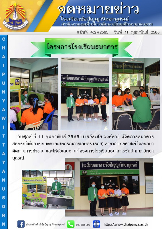 วันศุกร์ ที่ 11 กุมภาพันธ์ 2565 นายวีระชัย วงค์ตาขี่ ผู้จัดการธนาคารสหกรณ์เพื่อการเกษตรและสหกรณ์การเกษตร (ธกส) สาขาอำเภอคำชะอี ได้ออกมาติดตามการทำงาน และให้ข้อเสนอแนะโครงการโรงเรียนธนาคารชัยปัญญาวิทยานุสรณ์ |