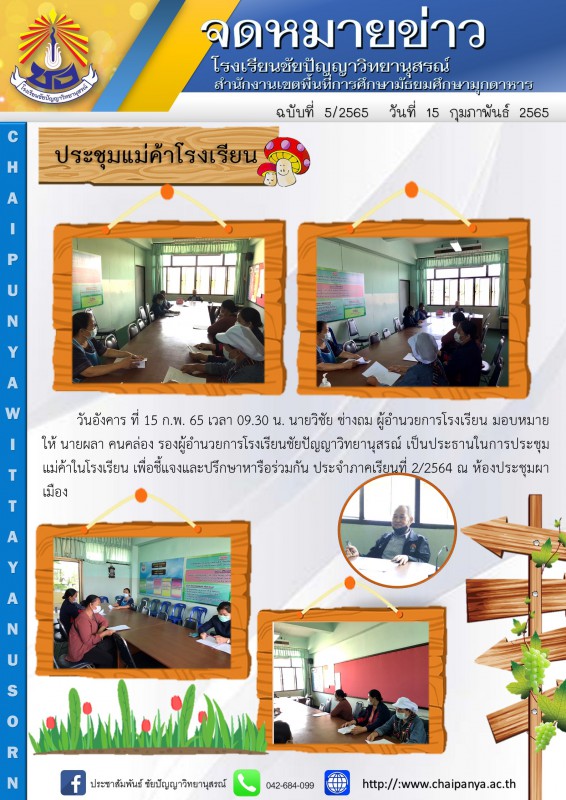 วันอังคาร ที่ 15 ก.พ. 65 เวลา 09.30 น. นายวิชัย ช่างถม ผู้อำนวยการโรงเรียน มอบหมายให้ นายผลา คนคล่อง รองผู้อำนวยการโรงเรียน เป็นประธานในการประชุมแม่ค้าในโรงเรียน เพื่อชี้แจงและปรึกษาหารือร่วมกัน ประจำภาคเรียนที่ 2/2564 ณ ห้องประชุมผาเมือง |