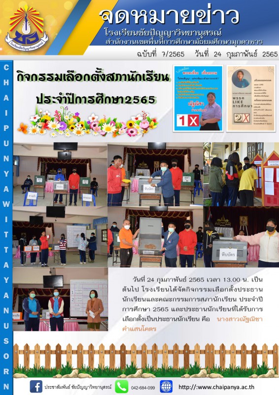 วันที่ 24 กุมภาพันธ์ 2565 เวลา 13.00 น. เป็นต้นไป โรงเรียนได้จัดกิจกรรมเลือกตั้งประธานนักเรียนและคณะกรรมการสภานักเรียน ประจำปีการศึกษา 2565 และประธานนักเรียนที่ได้รับการเลือกตั้งเป็นประธานนักเรียน คือ นางสาวณัฐณิชา คำแสนโคตร |