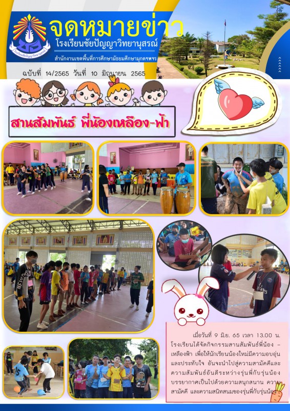 เมื่อวันที่ 9 มิ.ย. 65 เวลา 13.00 น. โรงเรียนได้จัดกิจกรรมสานสัมพันธ์พี่น้อง –เหลืองฟ้า เพื่อให้นักเรียนน้องใหม่มีความอบอุ่นและประทับใจ อันจะนำไปสู่ความสามัคคีและความสัมพันธ์อันดีระหว่างรุ่นพี่กับรุ่นน้อง บรรยากาศเป็นไปด้วยความสนุกสนาน ความสามัคคี และความสนิทสนมของรุ่นพี่กับรุ่นน้อง |
