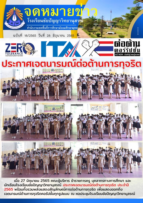 เมื่อ 27 มิถุนายน 2565 คณะผู้บริหาร ข้าราชการครู บุคลากรทางการศึกษา และนักเรียนโรงเรียนชัยปัญญาวิทยานุสรณ์ ประกาศเจตนารมณ์ต่อต้านการทุจริต ประจำปี 2565 พร้อมทั้งรวมพลังแสดงสัญลักษณ์การต่อต้านการทุจริต เพื่อแสดงออกถึงเจตนารมณ์ด้านการทุจริตคอรัปชั้นทุกรูปแบบ ณ หอประชุมโรงเรียนชัยปัญญาวิทยานุสรณ์