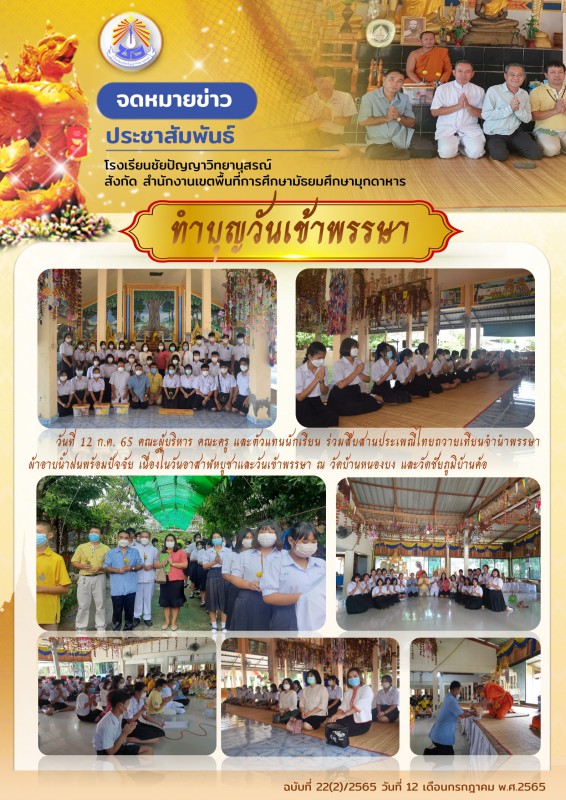 วันที่ 12 ก.ค. 65 คณะผู้บริหาร คณะครู และตัวแทนนักเรียน ร่วมสืบสานประเพณีไทยถวายเทียนจำนำพรรษา ผ้าอาบน้ำฝนพร้อมปัจจัย เนื่องในวันอาสาฬหบูชาและวันเข้าพรรษา ณ วัดบ้านหนองบง และวัดชัยภูมิบ้านค้อ