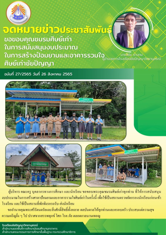 ขอขอบคุณชมรมศิษย์เก่า ในการสนับสนุนงบประมาณ ในการสร้างป้อมยามและอาคารรวมใจ ศิษย์เก่าชัยปัญญา