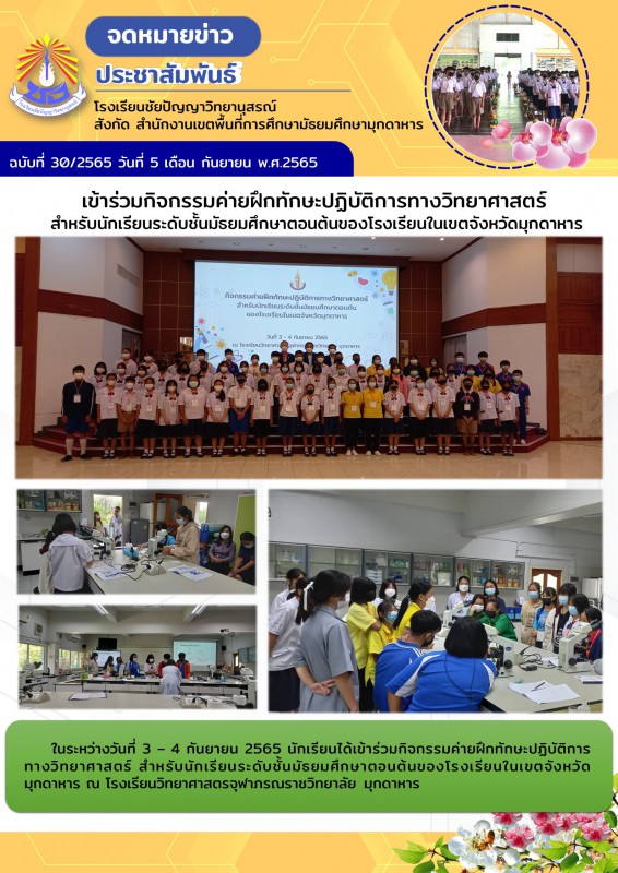 ในระหว่างวันที่ 3 – 4 กันยายน 2565 นักเรียนได้เข้าร่วมกิจกรรมค่ายฝึกทักษะปฏิบัติการทางวิทยาศาสตร์ สำหรับนักเรียนระดับชั้นมัธยมศึกษาตอนต้นของโรงเรียนในเขตจังหวัดมุกดาหาร ณ โรงเรียนวิทยาศาสตรจุฬาภรณราชวิทยาลัย มุกดาหาร