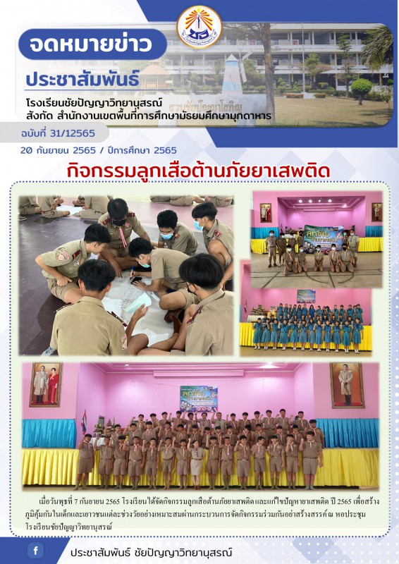 เมื่อวันพุธที่ 7 กันยายน 2565 โรงเรียนได้จัดกิจกรรมลูกเสือต้านภัยยาเสพติด และแก้ไขปัญหายาเสพติด ปี 2565 เพื่อสร้าง