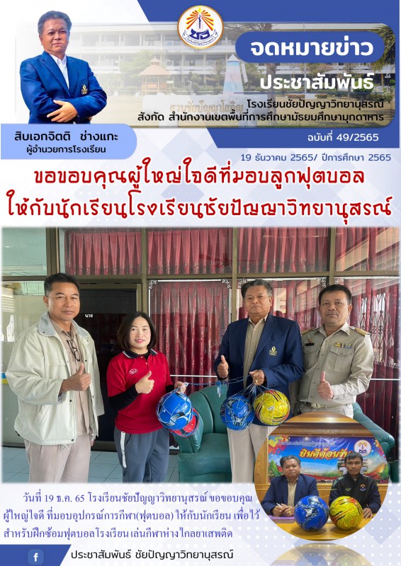 วันที่ 19 ธ.ค. 65 โรงเรียนชัยปัญญาวิทยานุสรณ์ ขอขอบคุณผู้ใหญ่ใจดี ที่มอบอุปกรณ์การกีฬา(ฟุตบอล) ให้กับนักเรียน เพื่อไว้สำหรับฝึกซ้อมฟุตบอลโรงเรียน เล่นกีฬาห่างไกลยาเสพติด
