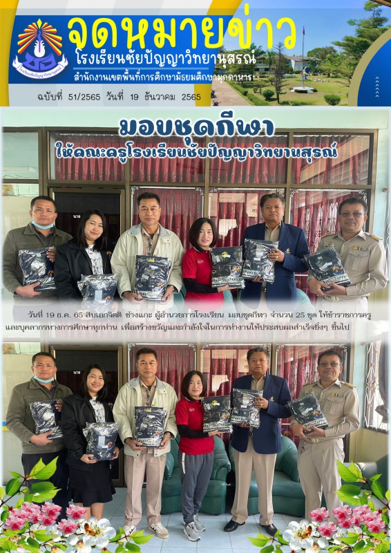 วันที่ 19 ธ.ค. 65 สิบเอกจิตติ ช่างแกะ ผู้อำนวยการโรงเรียน มอบชุดกีฬา จำนวน 25 ชุด ให้ข้าราชการครูและบุคลากรทางการศึกษาทุกท่าน เพื่อสร้างขวัญและกำลังใจในการทำงานให้ประสบผลสำเร็จยิ่งๆ ขึ้นไป