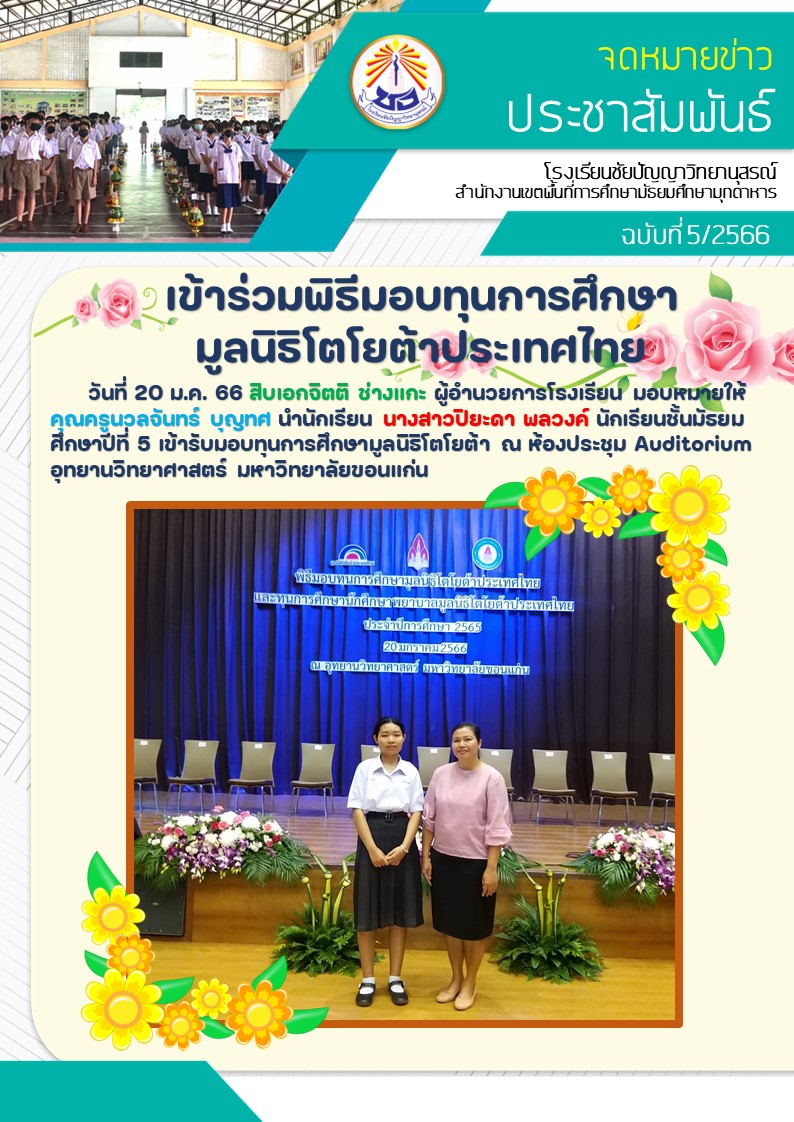 วันที่ 20 ม.ค. 66 สิบเอกจิตติ ช่างแกะ ผู้อำนวยการโรงเรียน มอบหมายให้คุณครูนวลจันทร์ บุญทศ นำนักเรียน นางสาวปิยะดา พลวงค์ นักเรียนชั้นมัธยมศึกษาปีที่ 5 เข้ารับมอบทุนการศึกษามูลนิธิโตโยต้า ณ ห้องประชุม Auditoriumอุทยานวิทยาศาสตร์ มหาวิทยาลัยขอนแก่น