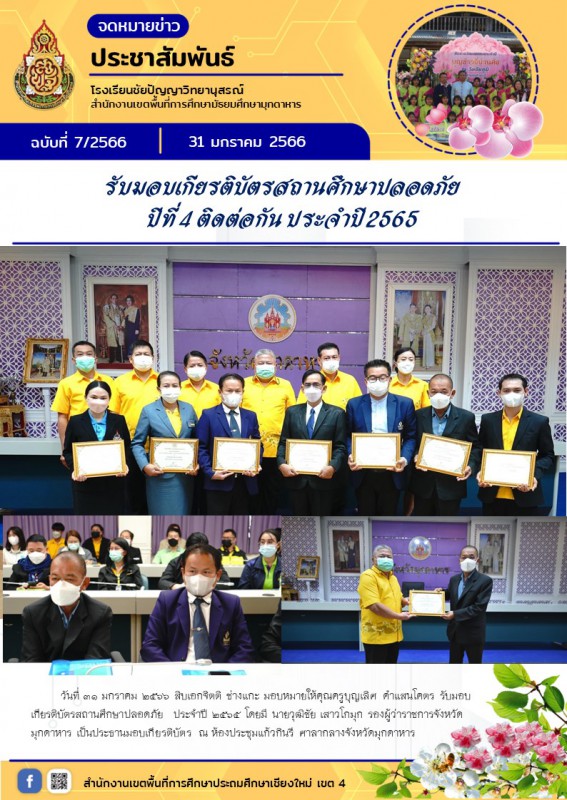 รับมอบเกียรติบัตรสถานศึกษาปลอดภัย ปีที่ 4 ติดต่อกัน ประจำปี 2565