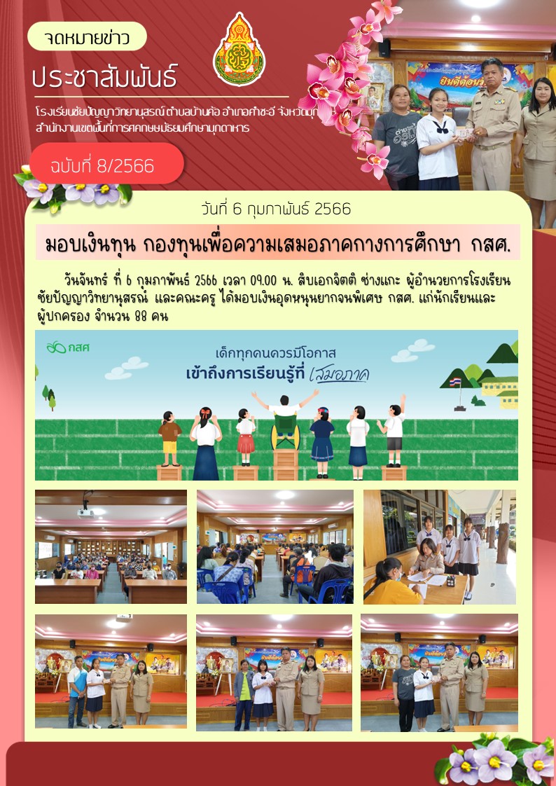 วันจันทร์ ที่ 6 กุมภาพันธ์ 2566 เวลา 09.00 น. สิบเอกจิตติ ช่างแกะ ผู้อำนวยการโรงเรียนชัยปัญญาวิทยานุสรณ์ และคณะครู ได้มอบเงินอุดหนุนยากจนพิเศษ กสศ. แก่นักเรียนและผู้ปกครอง จำนวน 88 คน