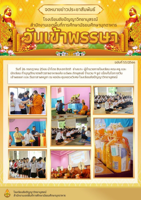 นักเรียน ทำบุญตักบาตรข้าวสารอาหารแห้ง แด่พระภิกษุสงฆ์ จำนวน 9 รูป เนื่องในโอกาสวันเข้าพรรษา และวันอาสาฬหบูชา