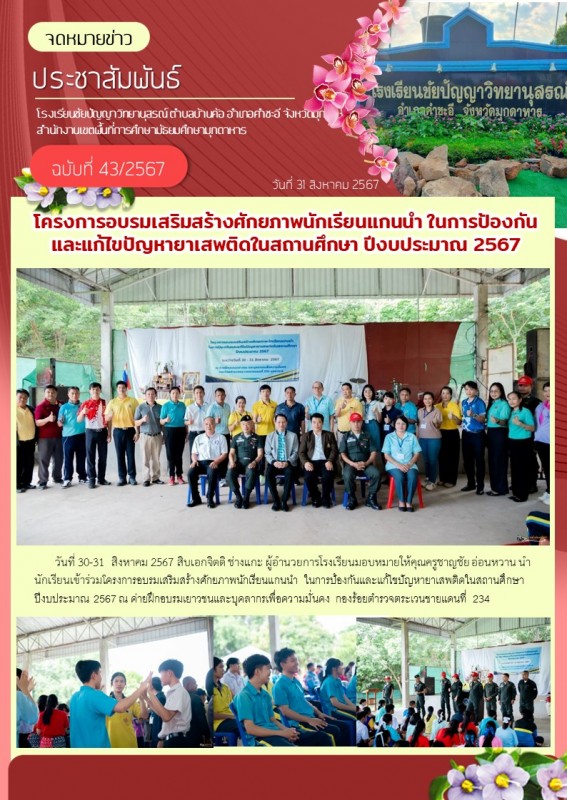 โครงการอบรมเสริมสร้างศักยภาพนักเรียนแกนนำ ในการป้องกันและแก้ไขปัญหายาเสพติดในสถานศึกษา ปีงบประมาณ 2567