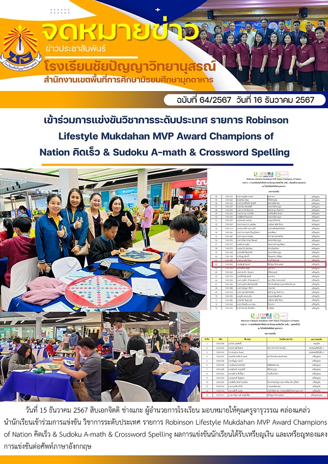 เข้าร่วมการแข่งขันวิชาการระดับประเทศ รายการ Robinson Lifestyle Mukdahan MVP Award Champions of Nation คิดเร็ว & Sudoku A-math & Crossword Spelling
