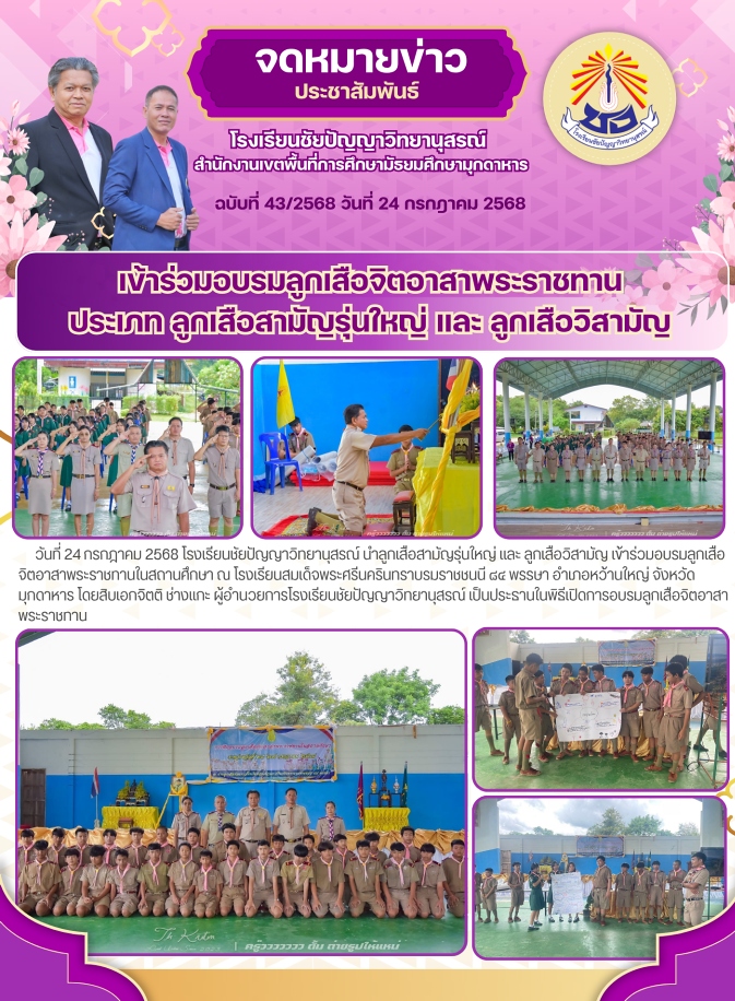 เข้าร่วมอบรมลูกเสือจิตอาสาพระราชทาน ประเภท ลูกเสือสามัญรุ่นใหญ่ และ ลูกเสือวิสามัญ ณ โรงเรียนสมเด็จพระศรีนครินทราบรมราชชนนี ๘๔ พรรษา อำเภอหว้านใหญ่ จังหวัดมุกดาหาร