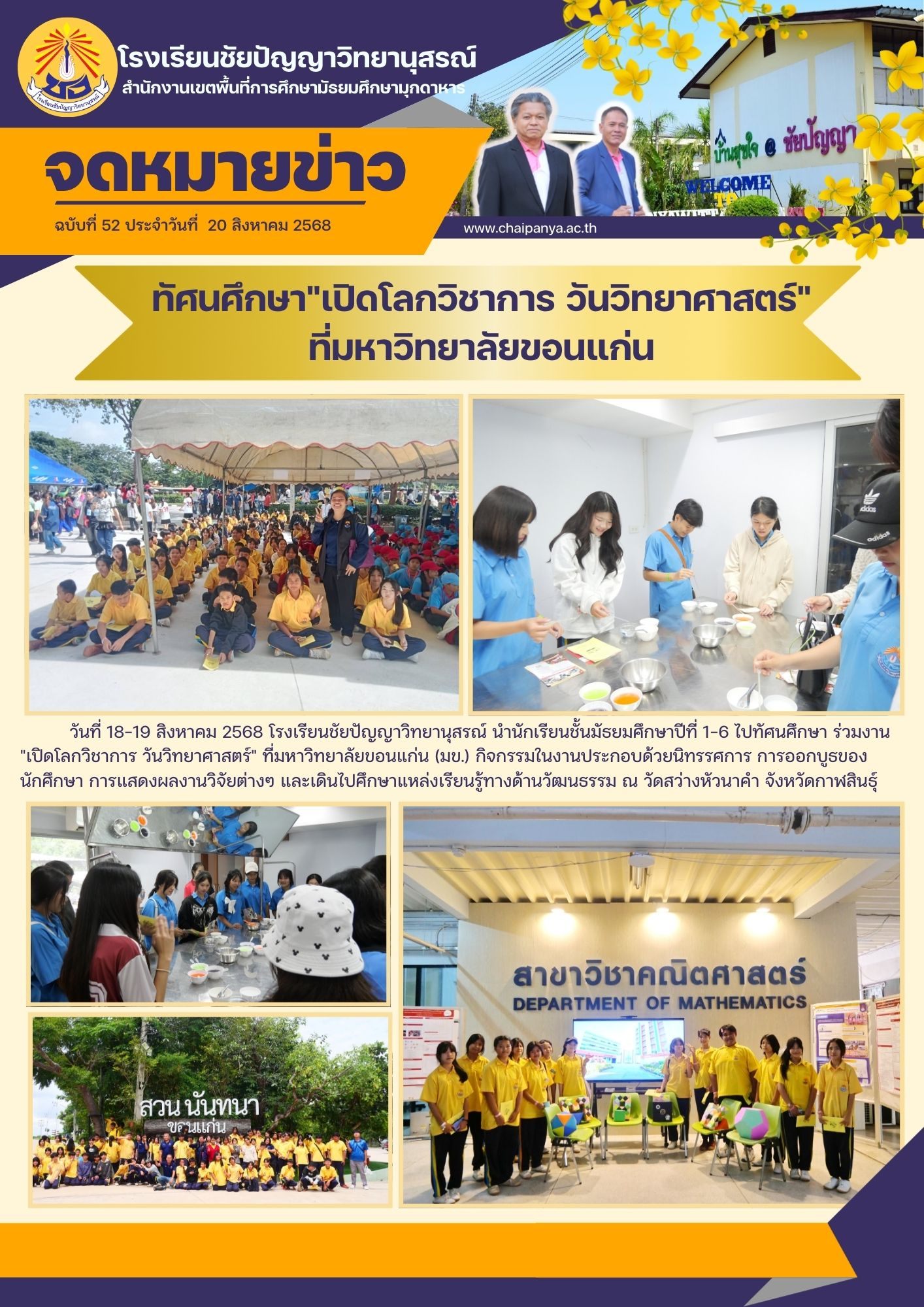วันที่ 18-19 สิงหาคม 2568 โรงเรียนชัยปัญญาวิทยานุสรณ์ นำนักเรียนชั้นมัธยมศึกษาปีที่ 1-6 ไปทัศนศึกษา ร่วมงาน "เปิดโลกวิชาการ วันวิทยาศาสตร์" ที่มหาวิทยาลัยขอนแก่น (มข.) กิจกรรมในงานประกอบด้วยนิทรรศการ การออกบูธของนักศึกษา การแสดงผลงานวิจัยต่างๆ และเดินไปศึกษาแหล่งเรียนรู้ทางด้านวัฒนธรรม ณ วัดสว่างหัวนาคำ จังหวัดกาฬสินธุ์ |
