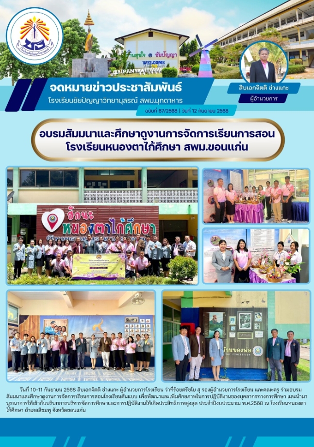 วันที่ 10-11 กันยายน 2568 สิบเอกจิตติ ช่างแกะ ผู้อำนวยการโรงเรียน ว่าที่ร้อยตรีชโย สุพร รองผู้อำนวยการโรงเรียน และคณะครู ร่วมอบรมสัมมนาและศึกษาดูงานการจัดการเรียนการสอนโรงเรียนต้นแบบ เพื่อพัฒนาและเพิ่มศักยภาพในการปฏิบัติงานของบุคลากรทางการศึกษา และนำมาบูรณาการให้เข้ากับบริบทการบริหารจัดการศึกษาและการปฏิบัติงานให้เกิดประสิทธิภาพสูงสุด ประจำปีงบประมาณ พ.ศ.2568 ณ โรงเรียนหนองตาไก้ศึกษา อำเภอสีชมพู จังหวัดขอนแก่น |