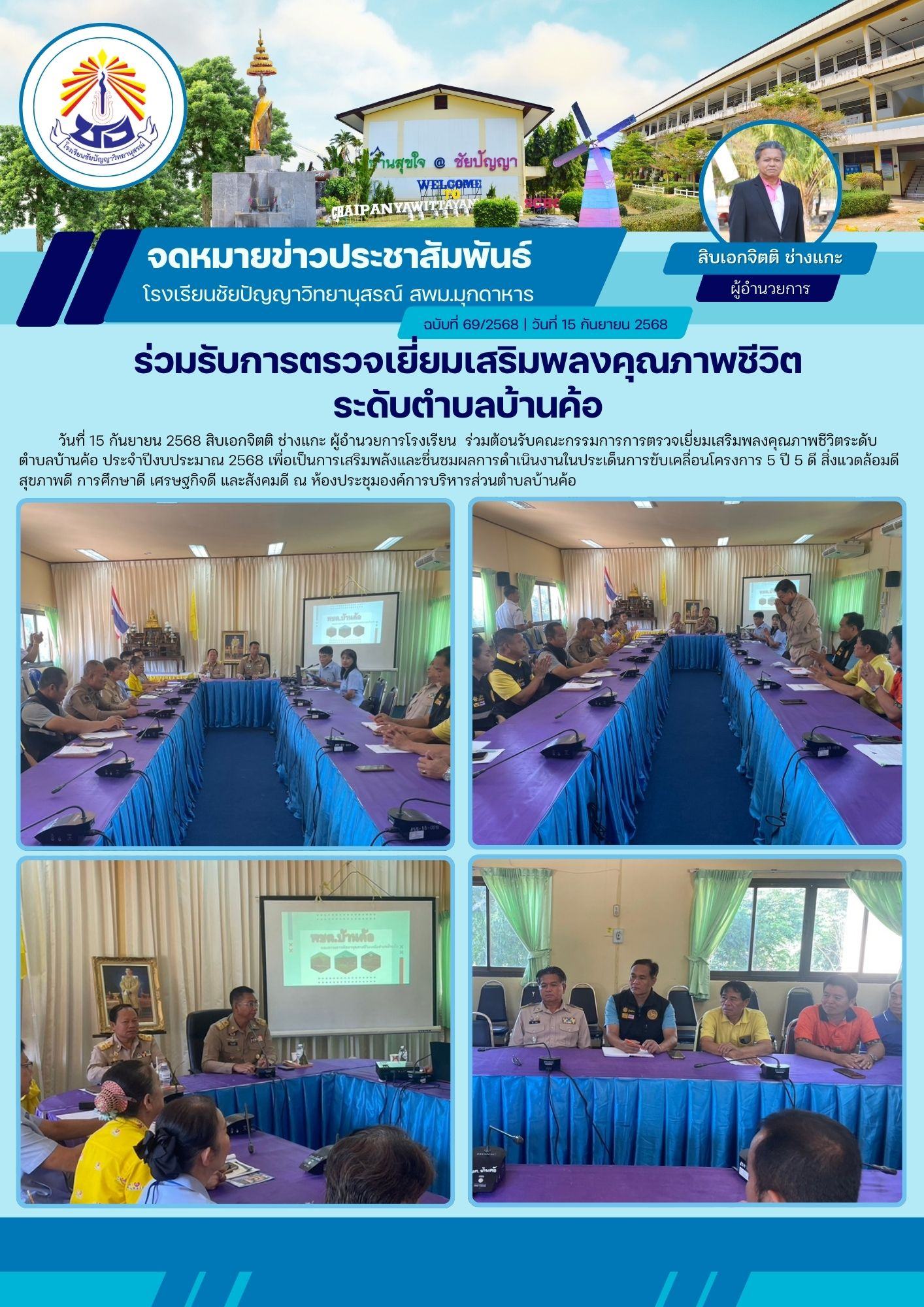วันที่ 15 กันยายน 2568 สิบเอกจิตติ ช่างแกะ ผู้อำนวยการโรงเรียน ร่วมต้อนรับคณะกรรมการการตรวจเยี่ยมเสริมพลงคุณภาพชีวิตระดับตำบลบ้านค้อ ประจำปีงบประมาณ 2568 เพื่อเป็นการเสริมพลังและชื่นชมผลการดำเนินงานในประเด็นการขับเคลื่อนโครงการ 5 ปี 5 ดี สิ่งแวดล้อมดี สุขภาพดี การศึกษาดี เศรษฐกิจดี และสังคมดี ณ ห้องประชุมองค์การบริหารส่วนตำบลบ้านค้อ |
