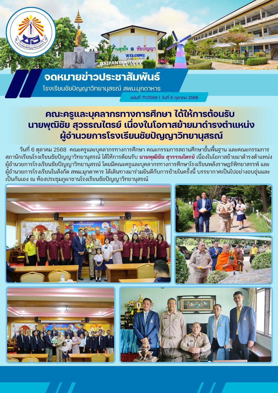 วันที่ 6 ตุลาคม 2568 คณะครูและบุคลากรทางการศึกษา คณะกรรมการสถานศึกษาขั้นพื้นฐาน และคณะกรรมการสภานักเรียนโรงเรียนชัยปัญญาวิทยานุสรณ์ ได้ให้การต้อนรับ นายพุฒิชัย สุวรรณไตรย์ เนื่องในโอกาสย้ายมาดำรงตำแหน่งผู้อำนวยการโรงเรียนชัยปัญญาวิทยานุสรณ์ โดยมีคณะครูและบุคลากรทางการศึกษาโรงเรียนพลังราษฎร์พิทยาสรรพ์ และผู้อำนวยการโรงเรียนในสังกัด สพม.มุกดาหาร ได้เดินทางมาร่วมยินดีกับการย้ายในครั้งนี้ บรรยากาศเป็นไปอย่างอบอุ่นและเป็นกันเอง ณ ห้องประชุมภูผาซานโรงเรียนชัยปัญญาวิทยานุสรณ์ |