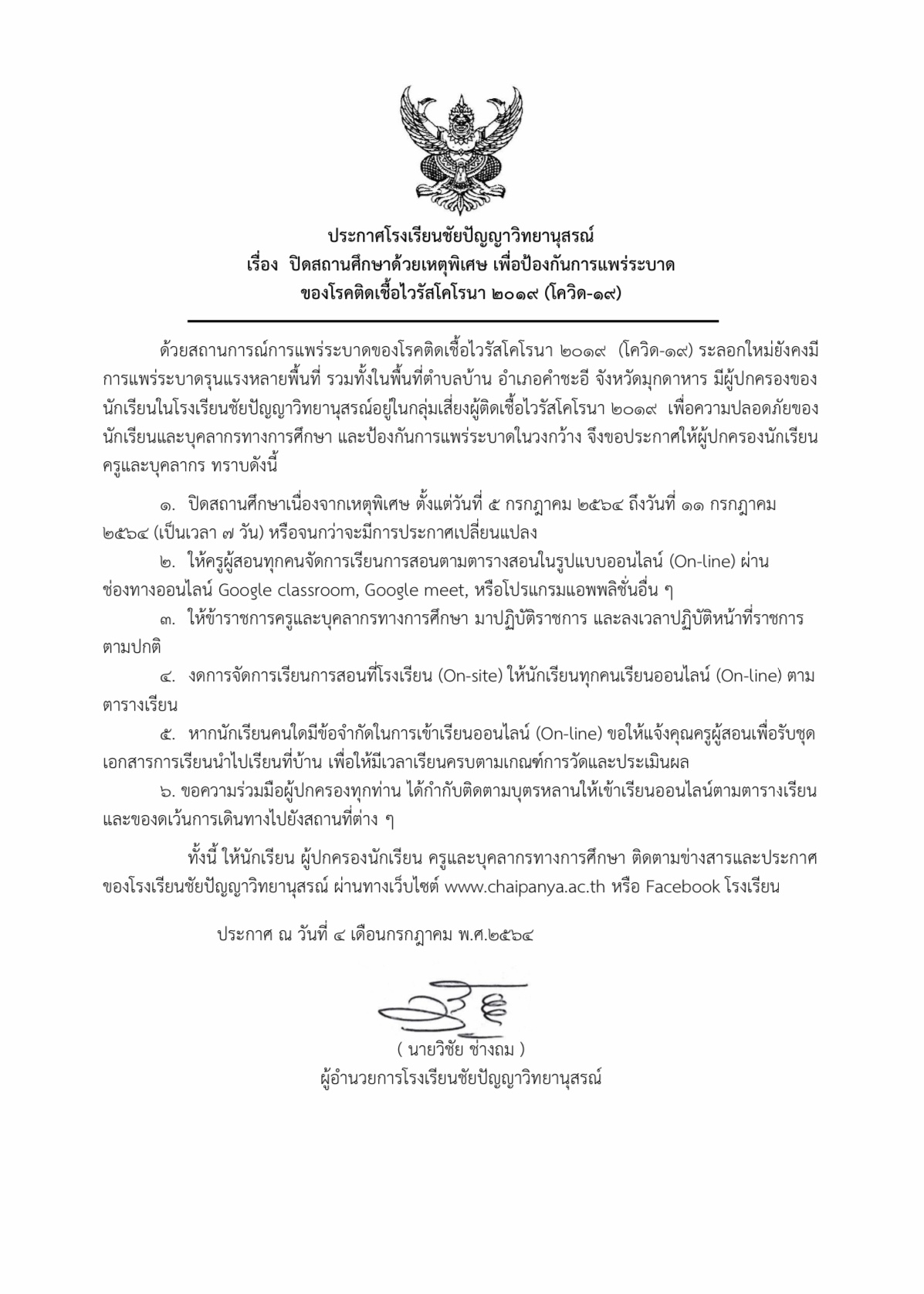 ประกาศปิดสถานศึกษาด้วยเหตุพิเศษ เพื่อป้องกันการแพร่ระบาดของเชื้อไวรัสโคโรนา 2019